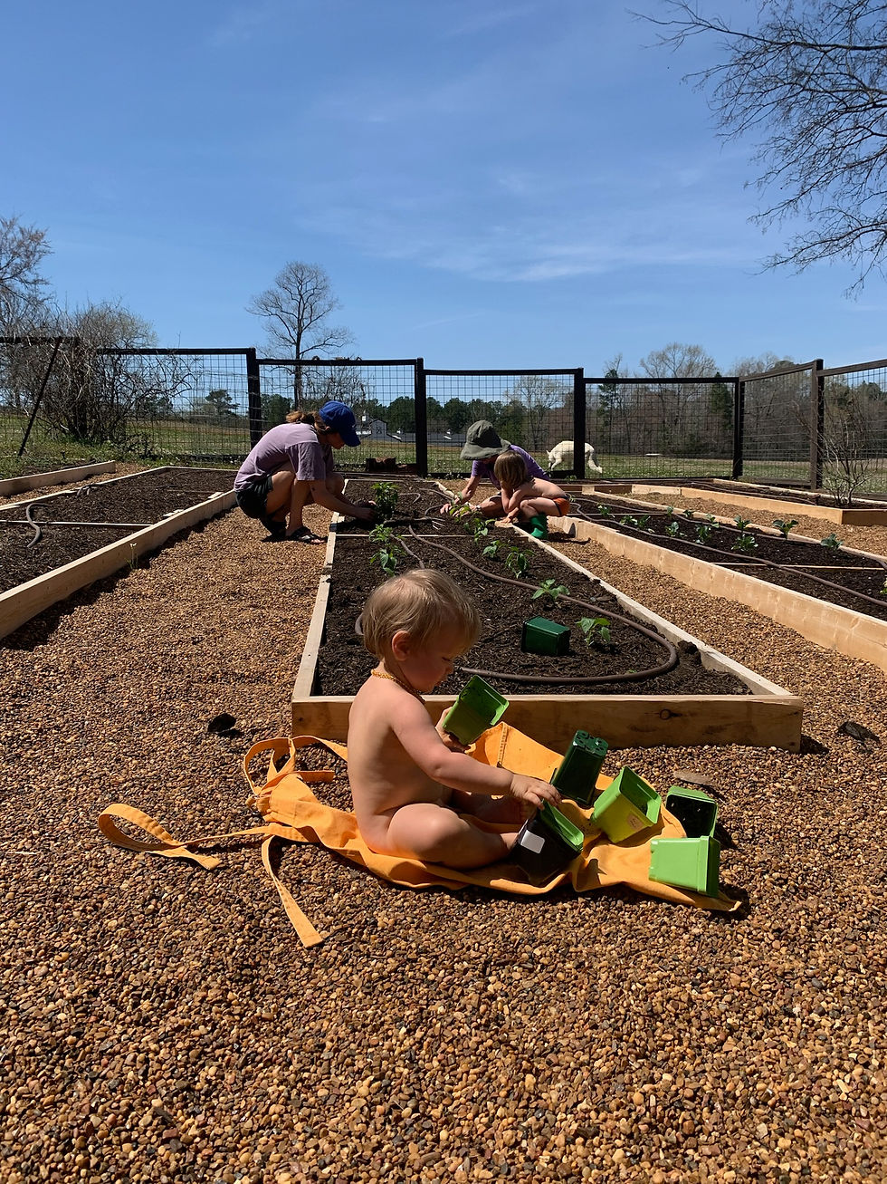 We love to bring the kiddos into the process of gardening with us, giving them jobs so we are all working together to grow and harvest. Generally the jobs they do are pretty simple - they are often digging holes and dropping in seeds. How exciting for the little ones to drop in a radish seed and just a few days later see it sprout up out of the ground. They get healthy dirt under their nails and we all get to spend awesome time together. It shows the children that we trust them to do good work and gives them autonomy and confidence to work along side us with their own responsibilities.